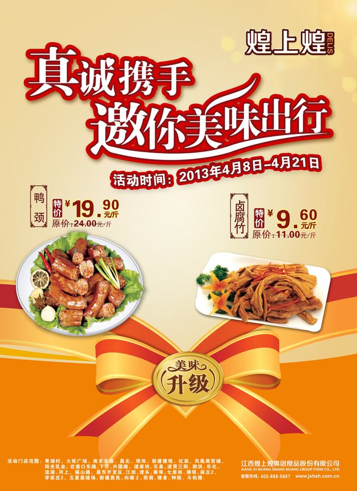 活動內(nèi)容:鴨脖特價19.9元/斤(原價24元/斤),鹵腐竹特價9.6元/斤(原價11元/斤)